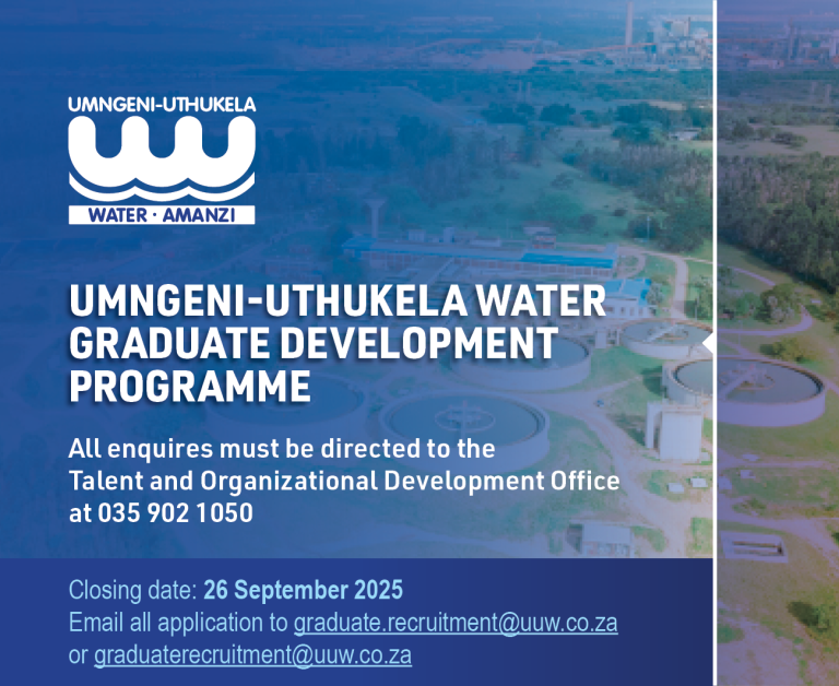 uMngeni-uThukela Water offers a thirty six (36) months training programmes under the below mentioned fields. Applicants who are residing in KwaZulu-Natal province and who are living with disability are invited to apply so as to gain practical work experience. These opportunities will available in Richards Bay and Pietermaritzburg.
