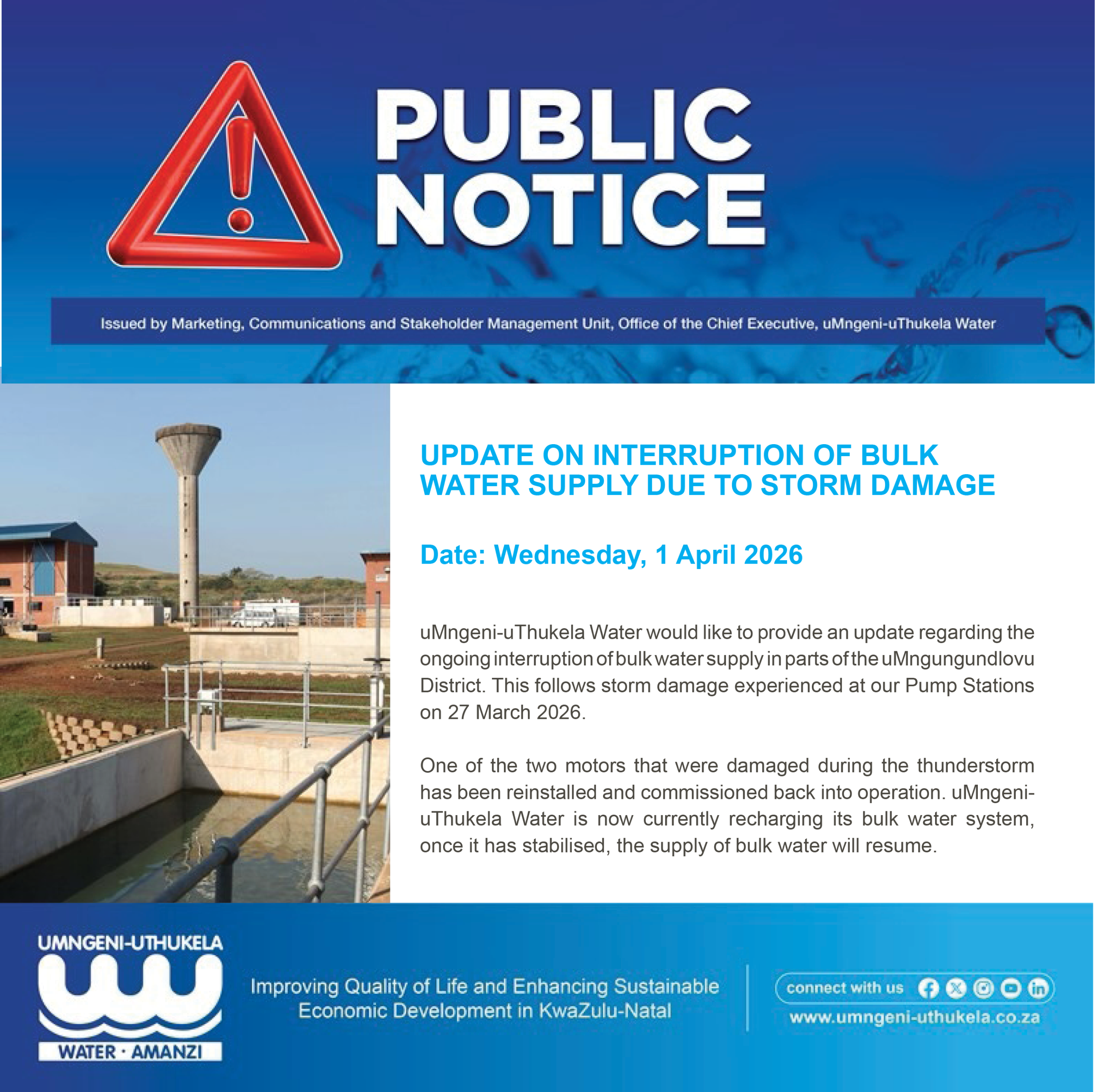 uMngeni-uThukela Water would like to provide an update regarding the ongoing interruption of bulk water supply in parts of the uMngungundlovu District. This follows storm damage experienced at our Pump Stations on 27 March 2026.