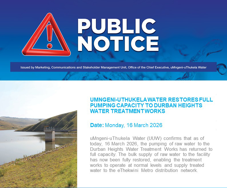 [vc_row][vc_column][vc_column_text]uMngeni-uThukela Water wants to reassure its customers that it will continue to provide its core services – supply of drinking water in bulk and treatment of wastewater, during the 21-day lock-down. Therefore, our municipal customers and consumers should have no concerns about reduced water supply or changes in excellent water quality that is distributed from water treatment plants that are operated by uMngeni-uThukela Water.